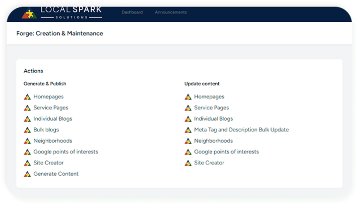 Local Spark Platform Solutions offers AI-powered software built for managing and monetizing networks of websites.